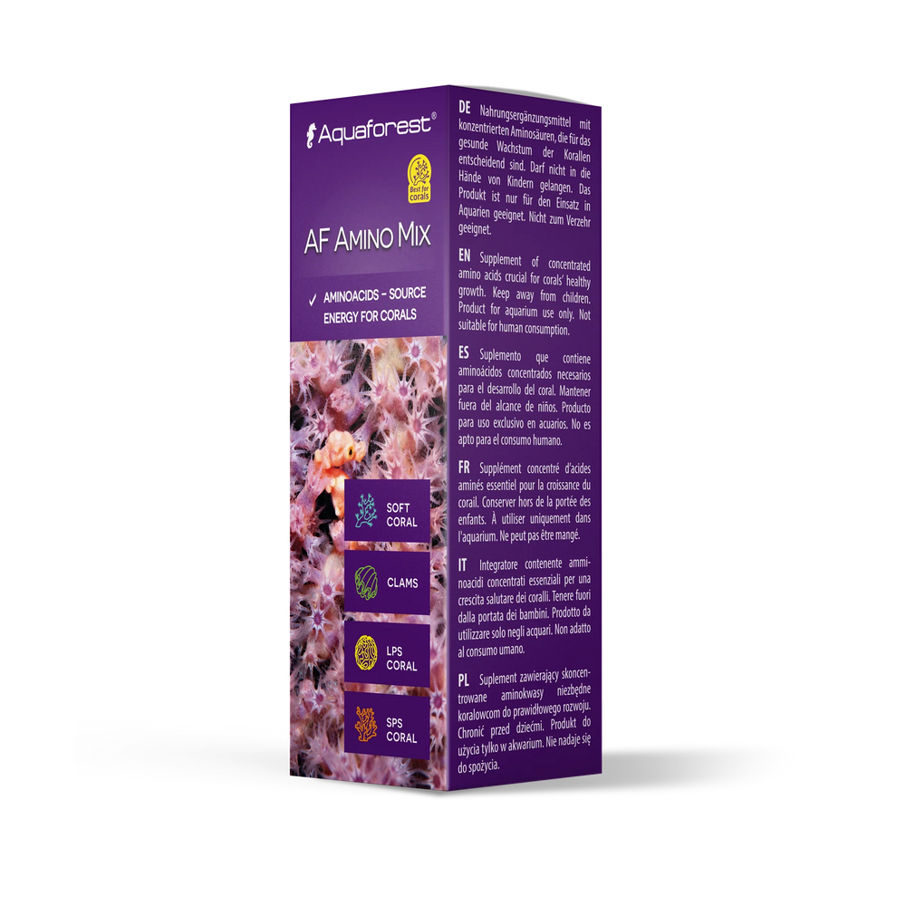 AF Amino Mix replenishes all essential amino acids, helping prevent bleaching and enhancing coral color. Its formula includes biotin, alanine, glutamine, leucine, lysine, serine, and more. This balanced mix increases the density of zooxanthellae, which boosts the production of photosynthetic pigments like chlorophyll. As a result, corals gain more energy from light, maintain excellent condition, and grow faster. Regular use strengthens immunity and noticeably accelerates growth.