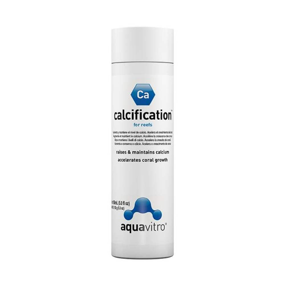 AquaVitro Calcification is a highly concentrated reef calcium supplement formulated to restore and maintain optimal calcium levels in marine and reef aquariums. With an industry-leading concentration of 140,000 mg/L, it delivers both ionic calcium and bioavailable gluconate-complexed calcium for immediate and sustained availability. This advanced formulation supports strong coral skeletal growth and calcification without altering pH or causing unwanted calcium carbonate precipitation. The gluconate component enhances calcium stability and uptake while also supporting natural denitrification processes, helping maintain long-term reef system balance. Calcification is ideal for daily dosing and precise calcium management in demanding SPS and mixed reef systems.